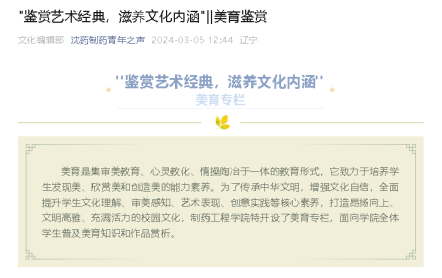 美育是集审美教育、心灵教化、情操陶冶于一体的教育形式,它致力于培养学生发现美、欣赏美和创造美的能力,全面提升学生文化理解、审美感知、艺术表现、创意实践等核心素养。best365足球官网将美育教育与文化建设相结合,在“制药青年之声”微信公众号上推出了"鉴赏艺术经典,滋养文化内涵"——美育鉴赏专栏,通过展示中国名画和名家书法,启迪学生对艺术审美的思考,打造昂扬向上、文明高雅、充满活力的校园文化,传承中华文明,增强文化自信。