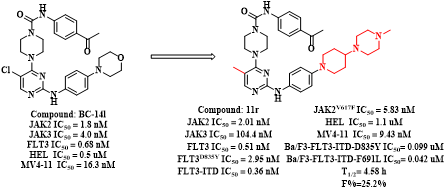 课题组前期研究获得优选化合物BC-14l(Bioorg Chem, 2020, 104: 104361),其对FLT3(IC50=0.68 nM)和JAK2(IC50=1.8 nM)表现出较强的抑制活性,但对JAK3(IC50=4.0 nM)也表现出一定的抑制作用。在AML治疗过程中,抑制JAK3会导致白细胞减少和感染等免疫抑制副作用。通过分子对接和蛋白叠合分析,发现JAK2和JAK3的RNI (Arg-Asn-Ile)和RD (Arg-Asp)序列组成的区域存在构象差异,使JAK2在该区域有较大的空腔,对该区域进行改造有望提高对JAK2的选择性。BC-14l与JAK2和JAK3的分子对接显示,嘧啶2位的取代基靠近此构象差异区域。因此,作者在嘧啶2位苯环上引入不同空间取向以及不同体积的取代基或者并入环系,得到一系列2-苯氨基嘧啶类化合物。其中,化合物11r对JAK2、FLT3和JAK3表现出抑制活性,IC50值分别为2.01 nM、0.51 nM和104.4 nM;对突变激酶也表现出优异的抑制活性,对FLT3D835Y、FLT3-ITD和JAK2V617F的IC50值分别为2.95 nM、0.36 nM和5.83 nM;对多种细胞系也表现出显著的抑制作用:HEL (IC50=1.1μM)、MV4-11(IC50=9.43 nM)、RPMI-8226(IC50=0.793μM)、NCI-H929(IC50=7.743μM)、Ba/F3-FLT3-ITD-D835Y(IC50=0.099μM)和Ba/F3-FLT3-ITD-F691L(IC50=0.042μM)。此外,11r表现出中等的肝微粒体稳定性,在HLMs中的半衰期为44.4 min,在RLMs中的半衰期为143 min。11r在大鼠中表现出可接受的药代动力学特性(Tmax=5.33 h, Cmax=38.7 ng/mL, AUC=522ng·h·mL-1, F=25.2%)。进一步研究表明,化合物11r以剂量依赖的方式诱导MV4-11细胞凋亡。化合物11r具有进一步开发的潜力。