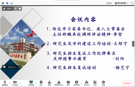 学院党委副书记刘阳为全体参加研究生复试工作的教职工做研究生招生复试工作纪律要求及师德警示教育。刘阳为参会老师介绍了复试纪律要求,她指出,在研究生复试工作中,全体老师要切实提高政治站位,切实增强纪律和规矩意识,共同营造风清气正的考试氛围;要切实认真干净履行职责,确保研究生招生复试各个环节安全有序;要切实加强各环节监督检查,严肃执纪问责。刘阳介绍了四个违反师德师风典型案例,引导学院教职工提高规则意识、底线意识,坚持立德树人,坚守为党育人、为国育才的初心和使命,努力为学校、学院发展贡献力量。