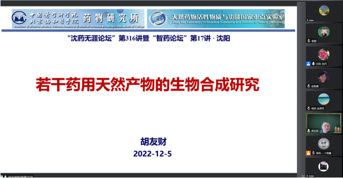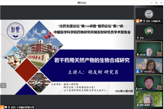 2022年12月5日上午,best365足球官网、研究生院、辽宁省药学研究生创新与学术交流中心联合举办了“沈药无涯论坛”第316讲暨“智药论坛”第17讲,中国医学科学院药物研究所胡友财研究员作了题为“若干药用天然产物的生物合成研究”的报告。会议由best365足球官网药物化学系主任刘丹教授主持,学院领导班子成员、研究生导师和研究生近300人参会。