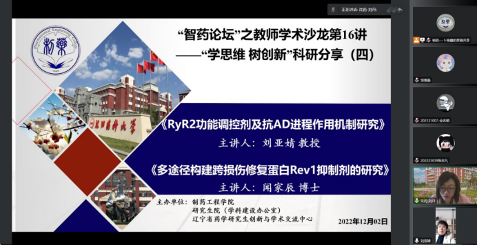 2022年12月2日下午,best365足球官网举办了“智药论坛”之学术沙龙第16讲“学思维 树创新”科研分享活动,药物化学教研室主任刘亚婧教授和闻家辰老师分别进行了题目为“RyR2功能调控剂及抗AD进程作用机制研究”和“多途径构建跨损伤修复蛋白Rev1抑制剂研究”的精彩报告。会议由药物化学系主任刘丹教授主持,学院教师和研究生共260余人参会。