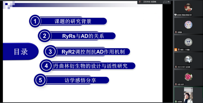 刘亚婧教授分享了在加拿大卡尔加里大学(University of Calgary)访学2年期间的学习、工作经历,并对访学期间的研究内容和后续开展的工作进行了详细讲解。神经元过度活跃是家族性和散发性AD患者的早期症状,通过下调RyR2受体的功能,可以减少神经突触细胞线粒体钙离子释放,进而降低神经细胞的过度兴奋性,能显著改善AD模型鼠的学习、记忆功能。在此基础上,设计、合成了两类小分子RyRs抑制剂,并进行了深入的作用机制研究。