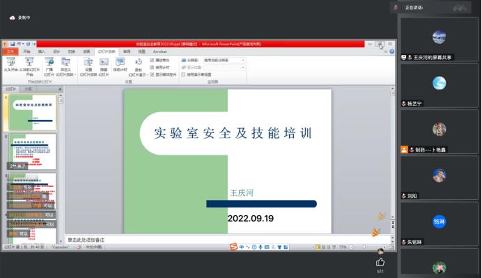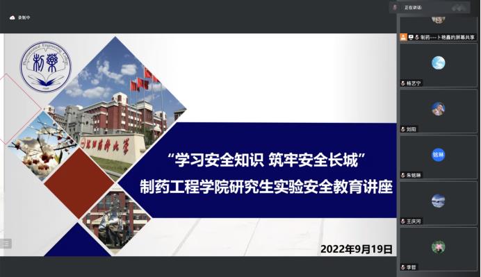 为强化研究生实验安全意识,提高个人防护能力,杜绝实验室安全事故的发生,9月19日,best365足球官网通过线上会议的方式举行了“学习安全知识,筑牢安全长城”研究生实验安全教育讲座,特别邀请学院化学实验中心副主任王庆河担任主讲人。学院党委书记李哲、党委副书记刘阳、研究生辅导员杨艺宁、朱铭琳及全体研究生参加了本次讲座,讲座由学院研究生辅导员卜艳鑫主持。