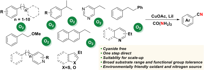 我们发现,采用CuOAc作为催化剂、尿素作为氮源、无水碘化锂作为添加剂,在氧气存在下可以将各类烷基取代的芳香类化合物转化为相应的有机腈产物。该方法底物适用性广泛,官能团耐受性良好,并且对于敏感性官能团如对甲苯磺酸基、酯基等的存在均能以良好的收率得到相应的腈。此外,对于一些长链取代的烷基芳烃,该方法也能以良好的选择性和收率得到相应的腈。此外,对于一些烷基取代的芳杂环类化合物,该方法同样适用。通过克级反应和混合底物实验进一步证明了该方法的普适性。