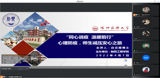 专家指导,呵护心灵。先后邀请辽宁省心理特级教师白云阁博士、辽宁教育学院高校发展研究与评估所副所长宋芳博士分别面向教工、研究生、本科生开展了“心理防疫,师生减压安心之旅”和“疫情下大学生适应与调节”线上心理健康讲座,用大量生动鲜活的事例和全面详实的数据分析了受疫情影响可能带来的心理问题,客观剖析了产生不良负面情绪和心理压力的原因,分享了疫情下师生心理自我调适和情绪管理的方式方法,一定程度上消除了师生的心理不适与负面压力,激励了师生齐心抗疫的坚强斗志。