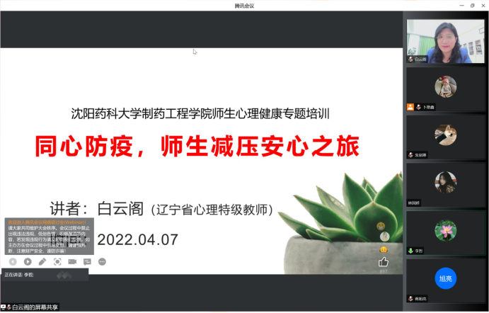 在近两小时的讲座中,白老师分析了当前疫情下的师生心理健康状况,从环境-生理-心理交互影响的视角阐述了疫情下教师心理自我调适的基本方法,讲解如何学会“先处理情绪,再处理问题”,做到“矜平躁释,怡情悦性”。本次讲座进一步引领师生建立积极阳光的心态,提高心理免疫力,共筑师生心理安全防线。面对疫情防控形势,学院将进一步因时因势调整工作思路,创新工作模式,在疫情防控期间全面助力保障学生心理健康。