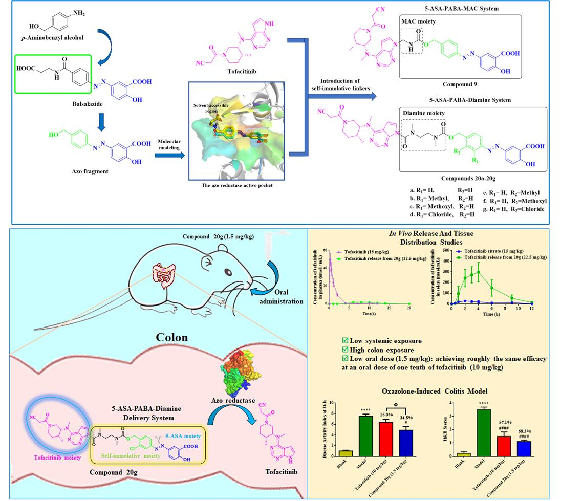 课题组成功开发了5‑ASA−PABA−MAC和5‑ASA−PABA−Diamine两种结肠靶向释放系统。体内外释放和肠组织分布研究结果表明,在等摩尔量口服剂量下,化合物20g的血浆暴露量比托法替尼低3.67倍,说明化合物20g可以有效降低托法替尼的全身暴露量;化合物20g的结肠AUC(tofacitinib,0-12 h)值为1601.9 nmol/mL·h,比托法替尼高9.61倍,说明化合物20g可以显著增加托法替尼的结肠暴露量。体内结肠炎小鼠模型表明,当化合物20g的口服剂量(1.5 mg/kg)降低至托法替尼治疗剂量(10 mg/kg)的十分之一时,其体内药效与托法替尼大致相同。口服急性毒性研究表明,化合物20g在口服剂量2000 mg/kg下无明显毒副作用。上述结果表明,化合物20g能够有效地限制托法替尼的全身暴露,从而减轻严重的全身不良反应,进而可以增加托法替尼的结肠组织暴露量,来提高其对溃疡性结肠炎的治疗效果。因此,该化合物可以作为治疗溃疡性结肠炎的潜在候选药物。本研究中建立的两种结肠靶向释放系统5-ASA-PABA-MAC和5-ASA-PABA-Diamine均被证明能有效实现结肠靶向释放,表明它们也可以应用于其他与结肠疾病相关药物的前药设计,以减少其全身副作用并提高其治疗效果。