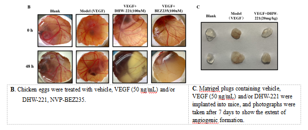 PI3K/AKT/mTOR信号通路的异常激活在肺癌特别是NSCLC的进展中起着重要作用。丁怀伟课题组以PI3K抑制剂GSK2292767 和HS-173为研究起点,采用拼合原理和骨架跃迁的设计策略,结合分子对接技术设计并合成了一系列苯并咪唑类衍生物,经过细胞水平、激酶水平活性筛选,并结合初步药代动力学研究得到了优选化合物DHW-221,其对PI3Kα的IC50值为0.5 nM,对肺癌细胞株HCC827和NCI-H1993表现出较好的选择性和较强的抑制活力。对该化合物进行了作用机制研究,结果表明DHW-221可呈剂量依赖性抑制肺癌异种移植皮下瘤的生长(图A),并显著抑制VEGF诱导的新生血管产生及生长(图B,C)。