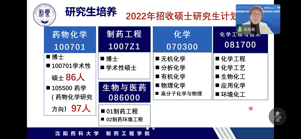 同时,作为药物化学学科负责人,赵临襄教授对于考生密切关注的2022年药物化学方向招生计划、学硕与专硕报考及培养方向的异同点以及学科导师进行了深入解读,为考生提出专业学习方面的建议。