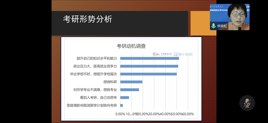 侯晓虹教授从考研动机调查和研究生招生调查出发,通过调研分析,阐述了化学工程与技术专业、生物与医药(制药环境工程)专业的报考需求、专业优势和学科特色,展示了化学工程与技术学科的科研团队及导师风采,并为考生送上寄语,希望在明年与各位学子“相约沈药”。