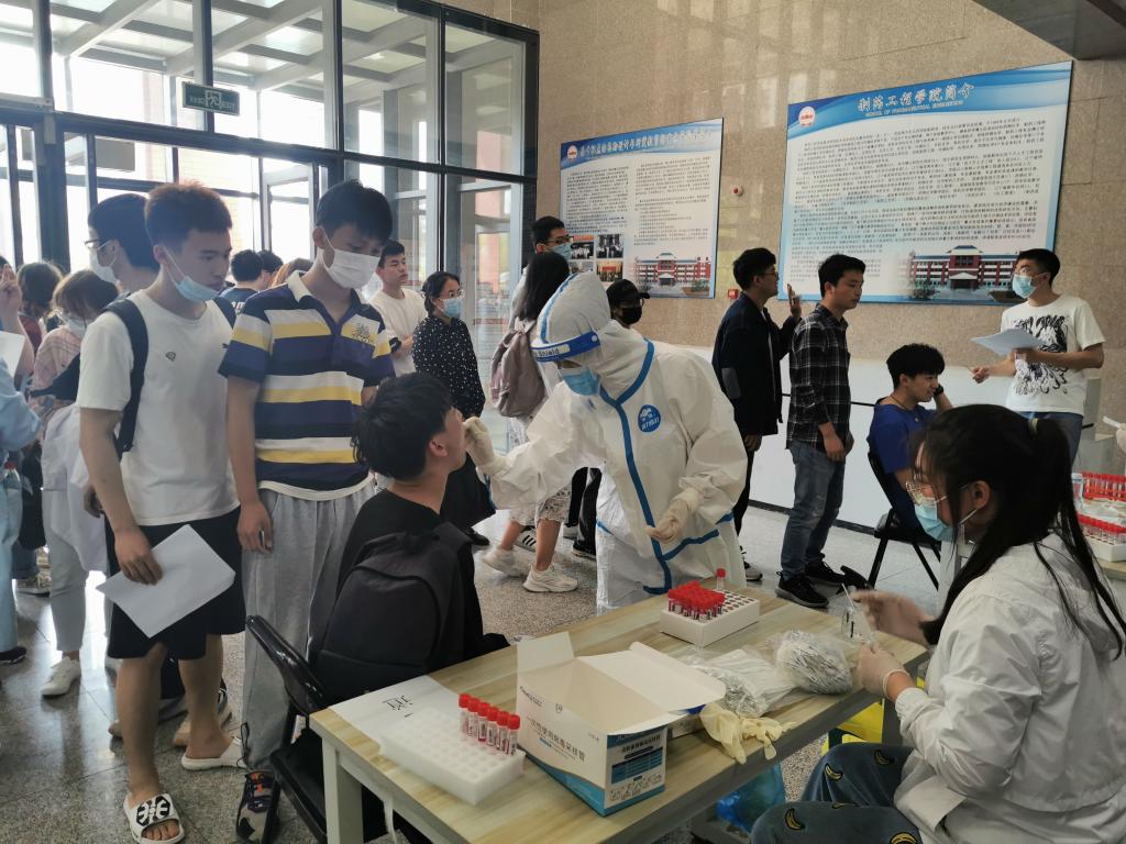 核酸检测采样工作于5月19日上午9时正式开始。学院在制药楼正门外合理划分区域,分别设置集合区、排队区及采样区,同时开通多条检测通道,所有待检人员严格遵守规定,提前集结,佩戴口罩,保持安全距离,分批分组检测后快速离场。