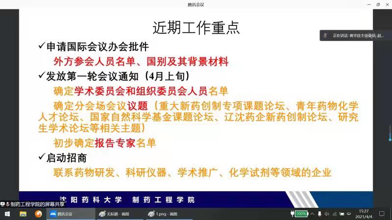 赵临襄院长首先介绍了中国药物化学学术会议的发展历程和召开背景,以及本次会议的整体办会方案;院长助理刘洋教授代表筹备工作委员会,向与会领导介绍了前期筹备工作,包括会议召开日期、组织机构、会议主题、备选场地以及申报情况;药化教研室主任刘丹教授介绍了会议经费的预算和筹备以及拟开展的招商工作计划。