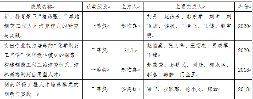 日前,2020年辽宁省普通高等教育本科教学成果奖评选结果公布,best365官网赵临襄教授主持的《新工科背景下“精药强工”卓越制药工程人才培养模式的研究与实践》荣获一等奖;刘丹教授主持的《突出专业能力培养的“化学制药工艺学”课程教学模式的探索》荣获三等奖。辽宁省教学改革成果每两年评选一次,截至目前,best365官网已连续两届在辽宁省教学成果奖评选中获一等奖。