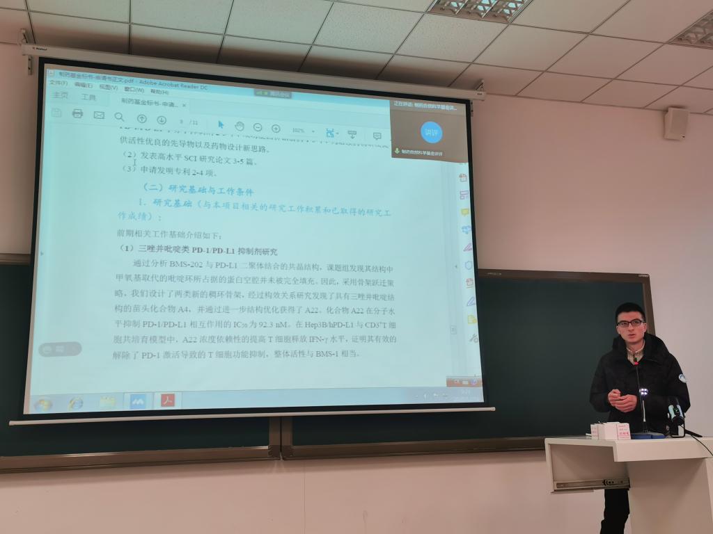 会上,有机化学教研室秦铭泽副教授结合自己撰写的题为“4-芳基吲哚啉类PD-1/PD-L1抑制剂及四价铂前药的设计、合成及活性研究”的申请书进行讲解,同时提出自身在申请书撰写过程中所遇到的问题,并结合申请书内容同与会教师进行深入探讨和交流。