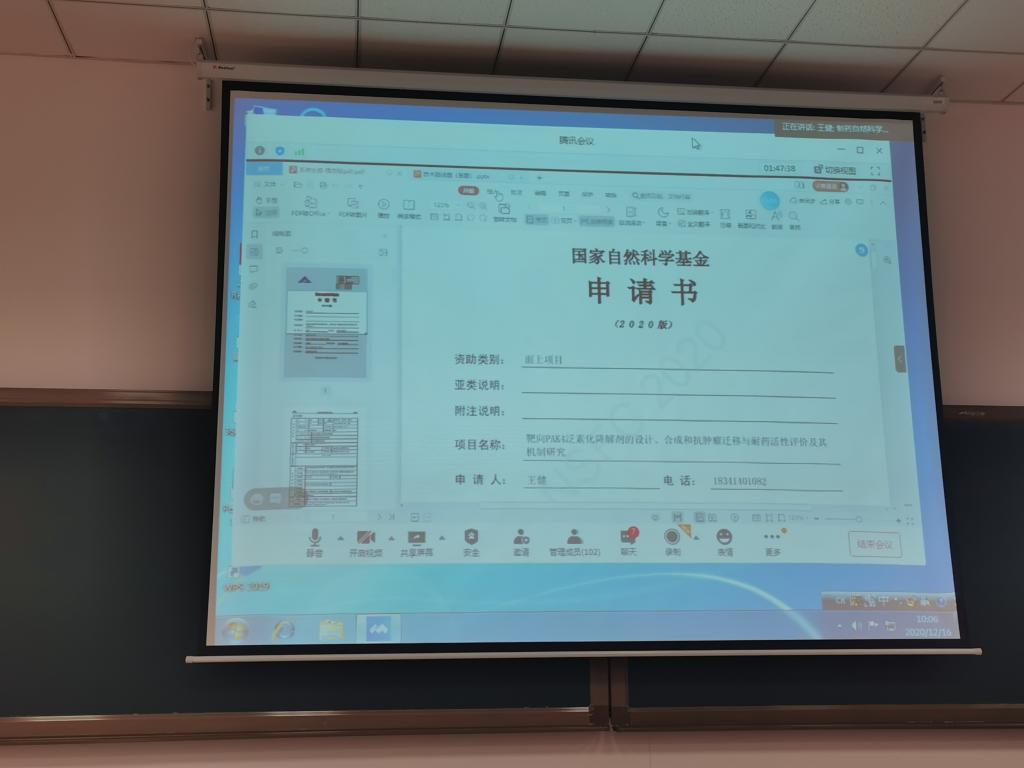 随后,讲评专家王健教授进一步对上述申请书的内容进行点评补充,指出撰写标书时注意科学问题的提出,围绕科学问题开展相关工作。同时王健教授对自身成功获批的2020年的面上项目进行经验分享。