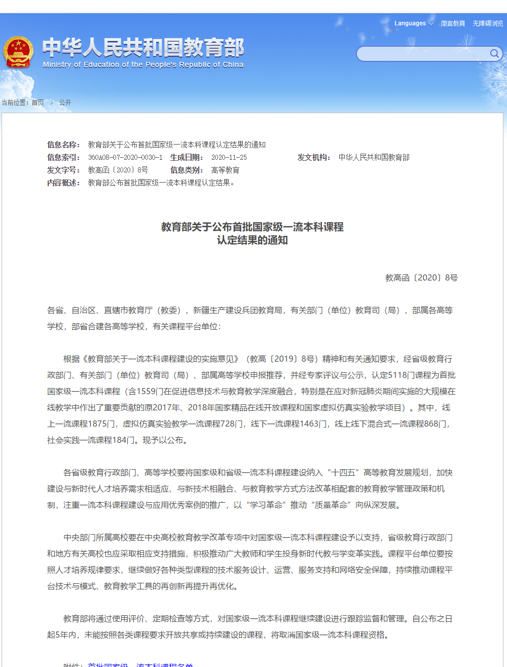 2020年11月25日,教育部公布了首批国家级一流本科课程认定结果,best365足球官网共有5门课程入选,其中best365足球官网的“化学制药工艺学”和“药物化学”课程成功入选线下一流课程。