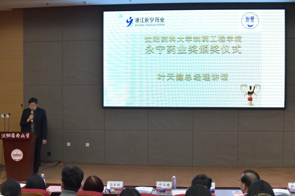 永宁药业总经理叶天健致辞,叶总表示,设立奖学金鼓励药学学子勤奋学习只是开启企业与学院双方合作的开端,未来永宁药业将与best365足球官网从学生培养、师资队伍建设、科研发展等诸多方面加深校企合作,通过教学与实践、科研与应用的密切结合,真正实现资源共享、优势互补、共同发展、互利共赢的目标。
