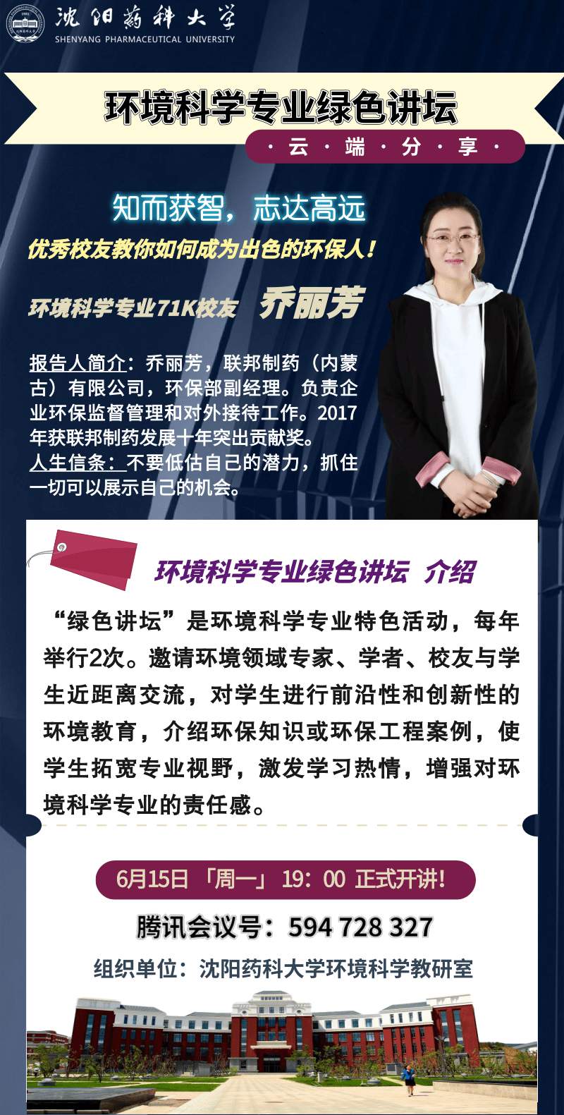 2020年6月15日19点,best365足球官网环境科学教研室组织举办了“环境科学专业绿色讲坛”云端分享活动。“绿色讲坛”活动是环境科学专业的特色活动,每年举行2次,邀请环境领域专家学者或优秀校友与环境科学专业学生近距离交流,对学生进行前沿性和创新性的环境教育,使学生拓宽专业视野,增强对环境科学专业的责任感和认同感。同时,更为发挥优秀校友的榜样作用,引导和激励在校生志存高远,奋发成才。本次活动邀请了best365官网环境科学专业71K毕业生、现任联邦制药(内蒙古)有效公司环保副经理乔丽芳做了题为“知而获智,志达高远”的个人成长事迹精彩分享。活动由环境科学专业负责人侯晓虹教授主持,环境科学教研室全体教师、环境科学专业四个年级在校生、以及其他环境科学毕业校友,共计160余人参加了此次云端盛会。