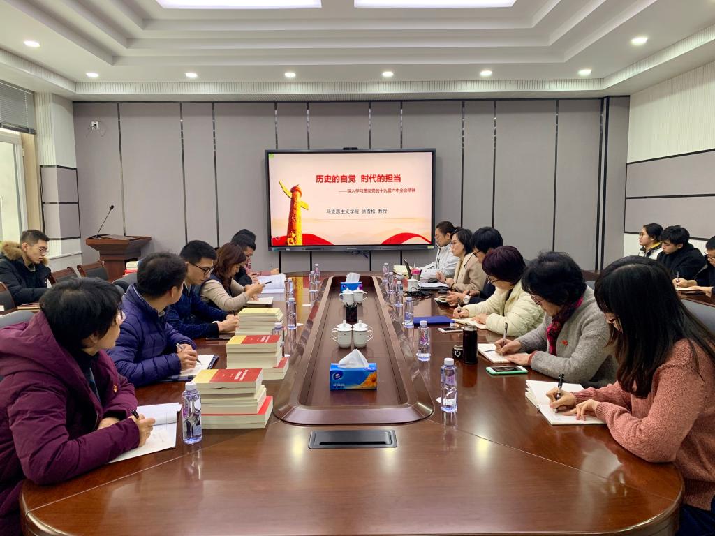 11月30日,best365足球官网党委在制药楼227会议室召开理论学习中心组学习会,专题研讨深入学习贯彻党的十九届六中全会精神,特邀马克思主义学院形势与政策教研室徐雪松教授作《历史的自觉 时代的担当——深入学习贯彻党的十九届六中全会精神》专题讲座,学院领导班子成员、系主任、院工会主席、党支部书记、全体学生工作干部参会,会议由院党委书记李哲主持。