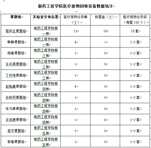 各课题组也积极相应学院号召,根据自身需求采购相应的医疗废物回收设备,分别放置于各实验室及大型仪器平台,不仅用于本实验室医疗废物垃圾投放,也可接收周围实验室产生的医疗废物,各课题组医疗废物回收设备配备情况如下: